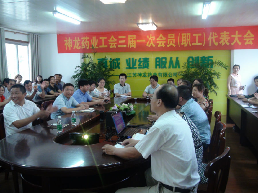 8月21日下午,公司召開工會三屆一次會員(職工)代表大會。會議在莊嚴的國歌聲中開幕。 市總工會陳部長代表市總工會及市經信委對本次會議的召開表示熱烈的祝賀。他指出,神龍藥業工會曾經獲得過鹽城市“模范之家”的稱號,希望本次會議選舉出的新一屆工會領導班子在黨政領導的重視及支持下,在習總書記重要講話精神的指導下,再次獲得“模范之家”的工會榮譽。希望工會圍繞生產,多舉辦健康有益的文體活動,多組織大家學習先進技術。也希望工會領導能切實關心職工生活,特別是困難職工的工作生活需求,幫助大家解決生活困難和實際問題。 公司總經理周平同志代表第二屆工會委員會向大會作《工會工作報告》。報告回顧了第二屆工委會近五年的工作成績,也總結出工作中存在的不足,給新一屆工委會提供了寶貴的經驗和建議。 與會的47名職工代表投票選舉出神龍藥業第三屆工會委員會、經審委員會、女工委員會的組成成員。會議一致通過由苗俊同志任新一屆工會主席。苗俊同志作為代表進行發言。他表示,絕不辜負大家的期望,將擔起責任,帶領新一屆“三委會”成員,圍繞公司全年目標任務,把廣大員工的智慧和力量凝聚到為公司建功立業上來;發揮工會民主管理和民主參與的作用,維護好職工的合法權益;積極開展各種文體活動,豐富員工文化生活,關心員工訴求,為員工說實話、辦實事,把工會真正建設成為員工之家。共同把公司建設成一個和諧幸福的大家庭。